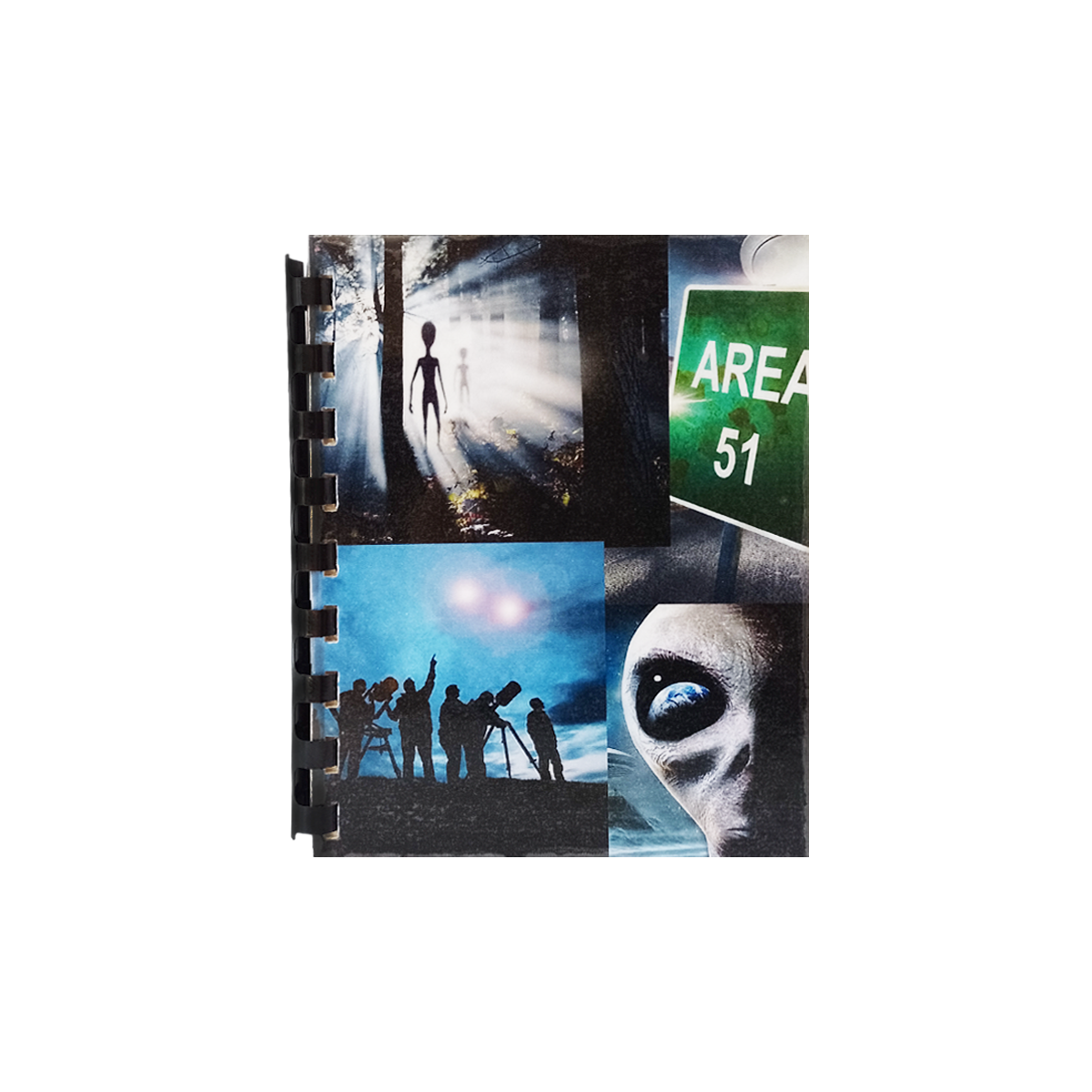 Agenda artesanal con diseño exclusivo de música y aliens, práctica, ecológica y perfecta para notas creativas.