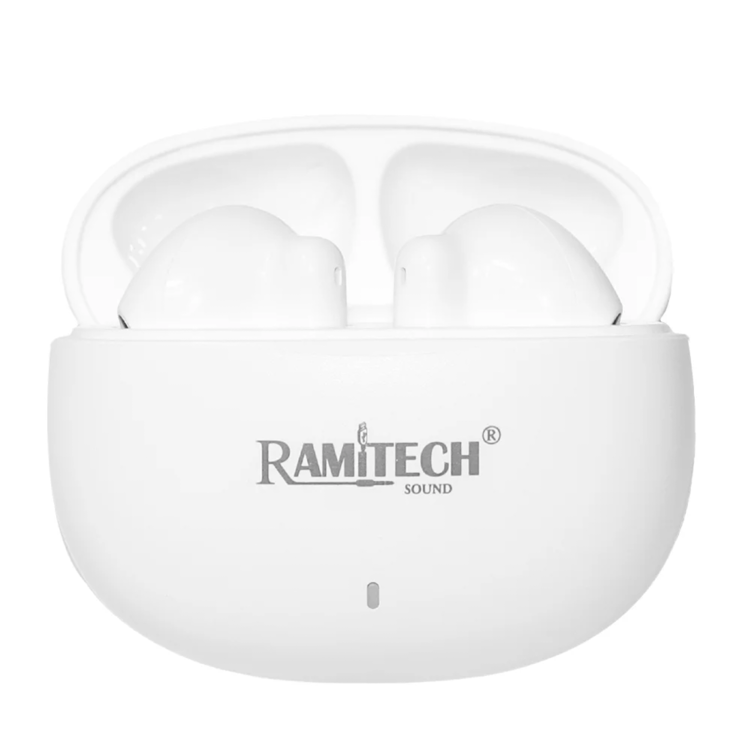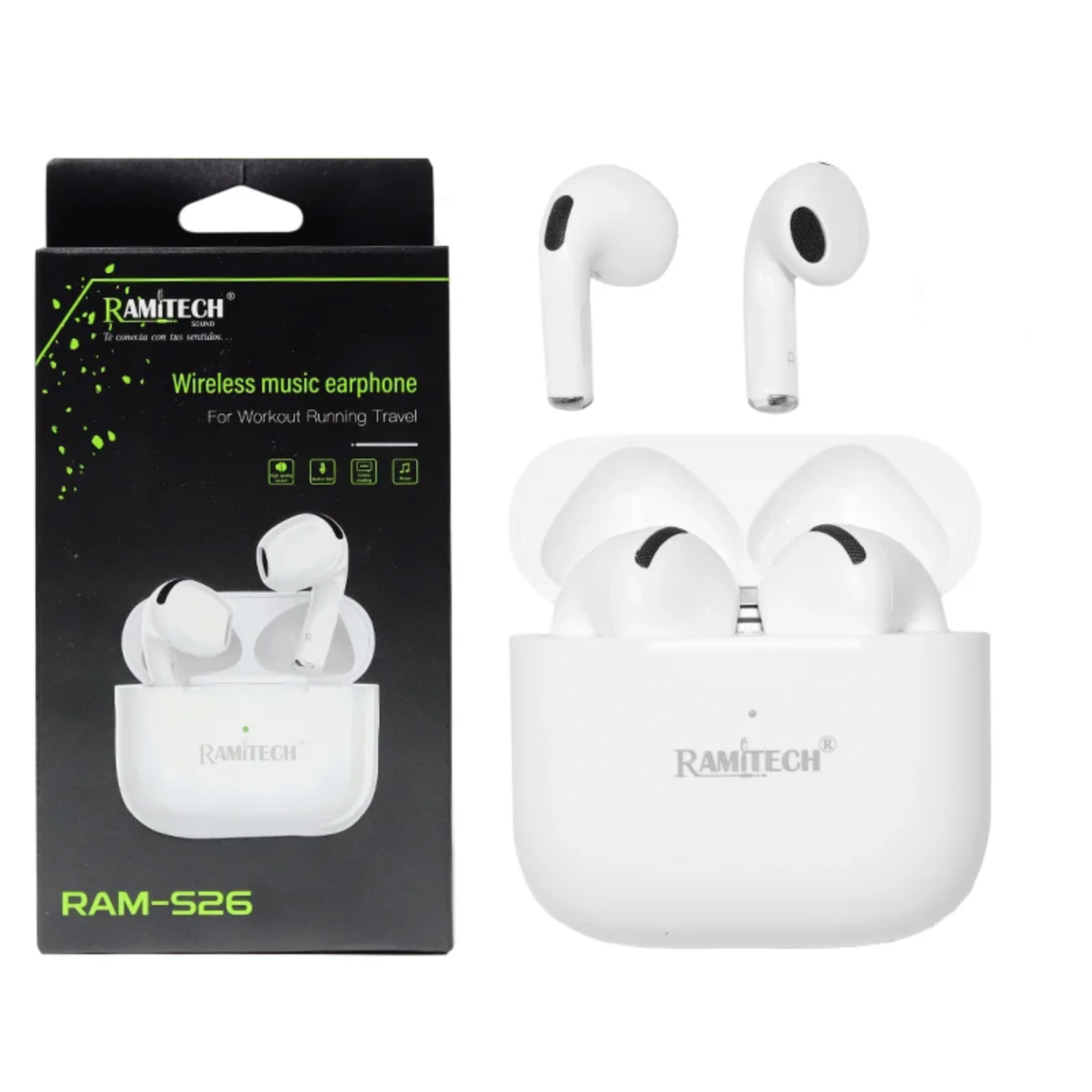 Audífonos TWS Ramitech RAM S26 con Bluetooth, micrófono y batería de 200 mAh para audio claro y libertad de movimiento.