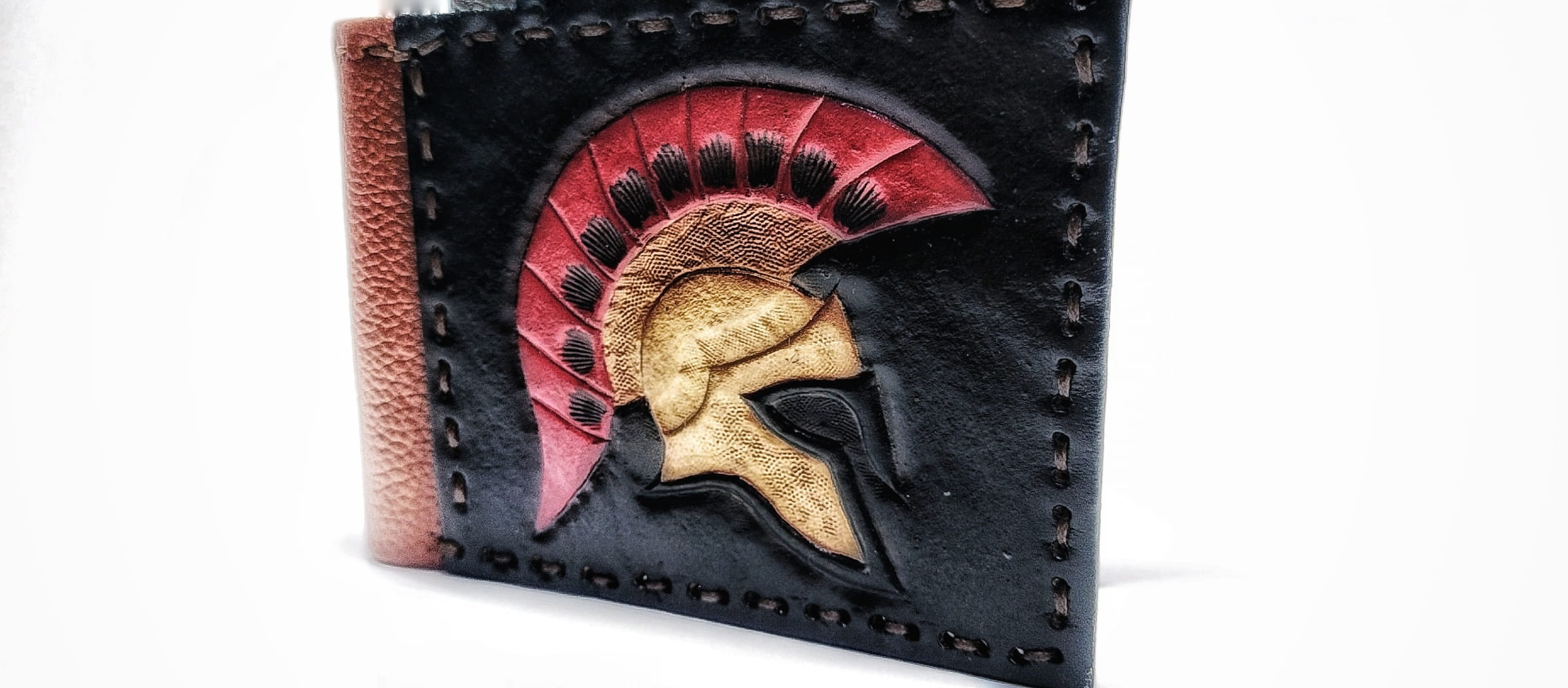 Billetera artesanal en cuero repujado con diseño espartano, elegante y resistente, hecha a mano en Colombia.