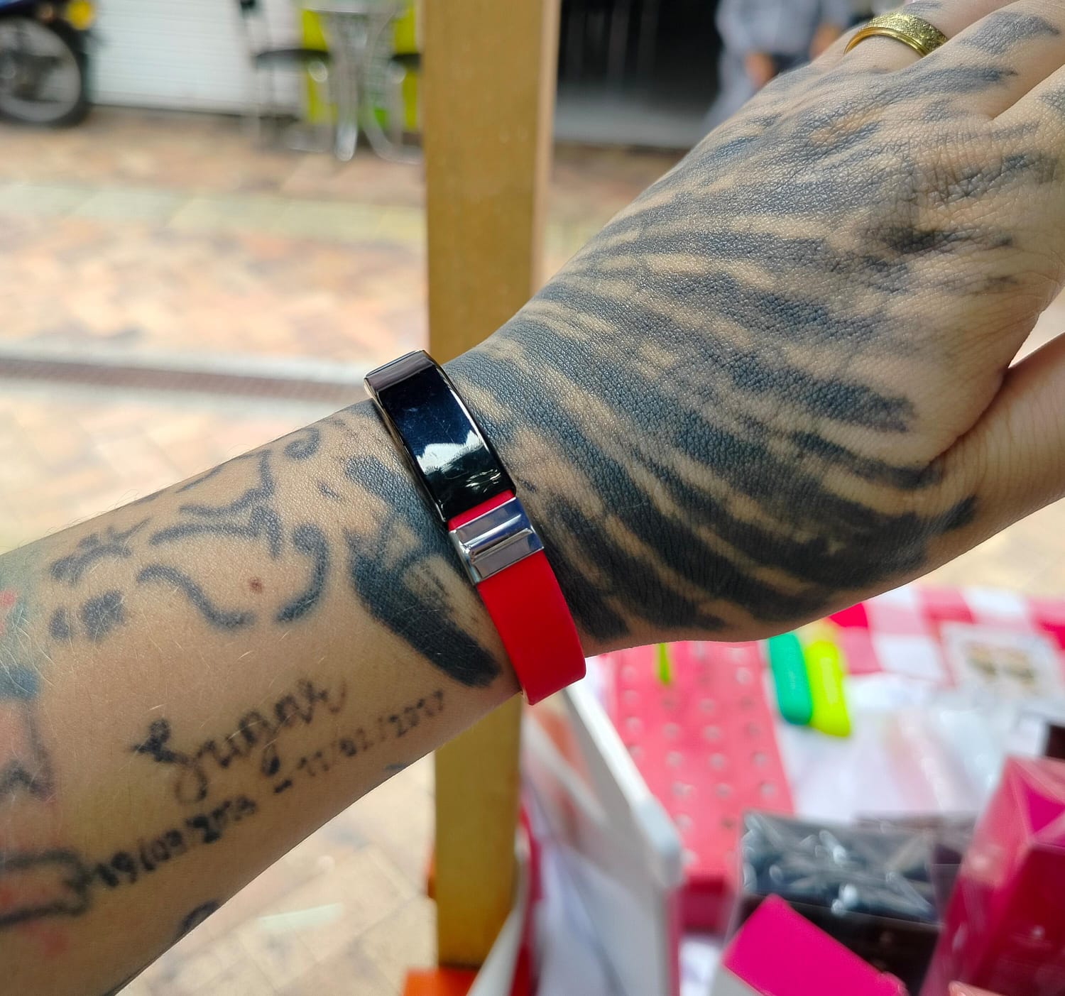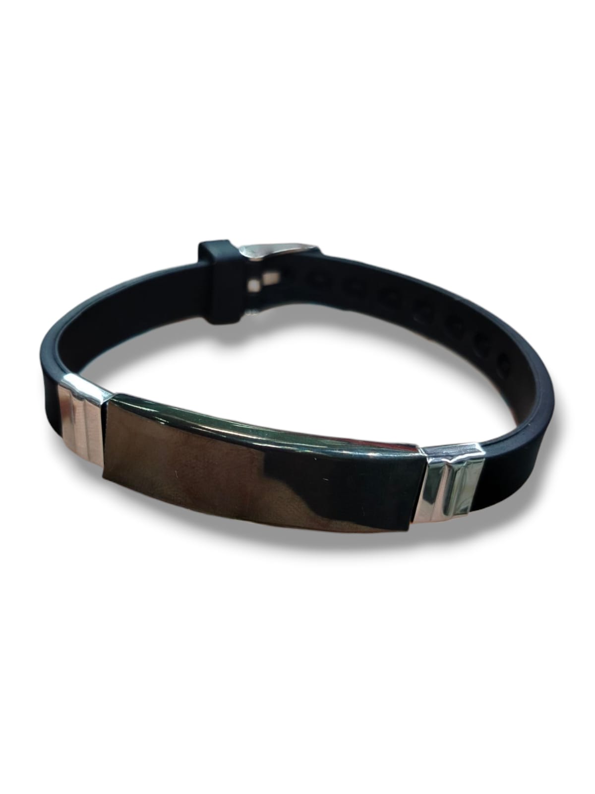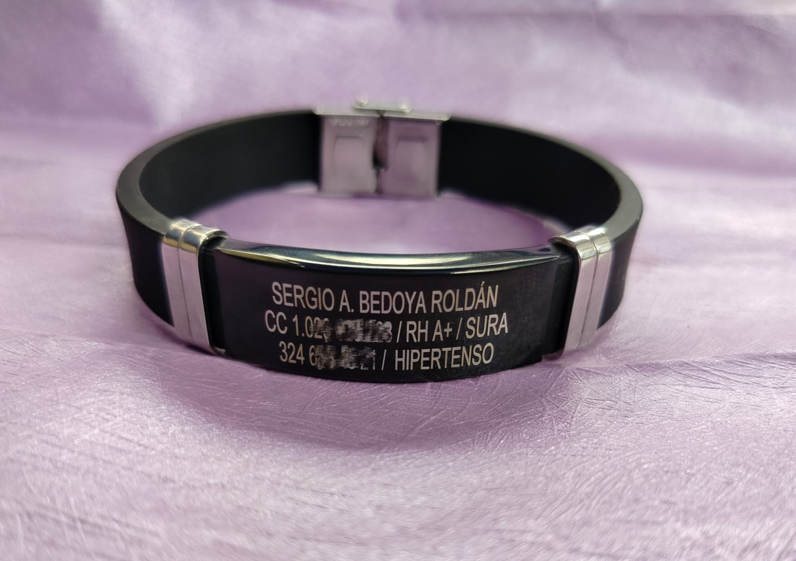 Brazalete personalizable en neopreno con placa de acero grabada a láser en variedad de colores modernos.