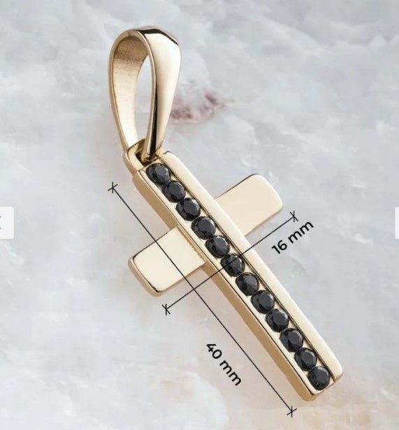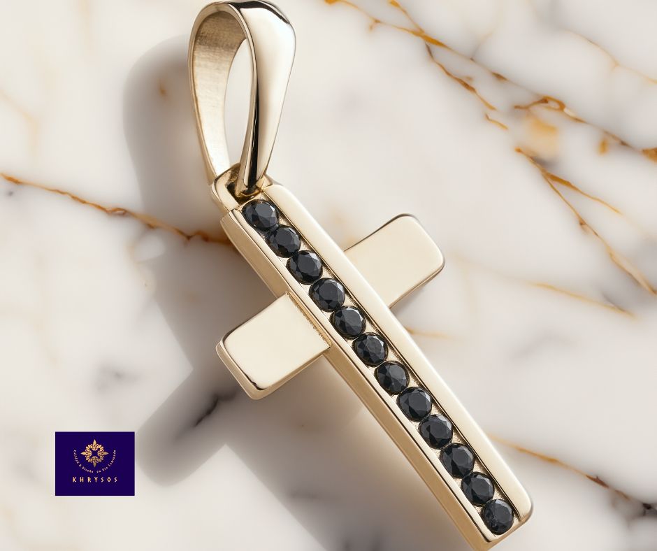 Cruz imperial con gemas negras en oro laminado premium y garantía de por vida, símbolo de fuerza y elegancia.