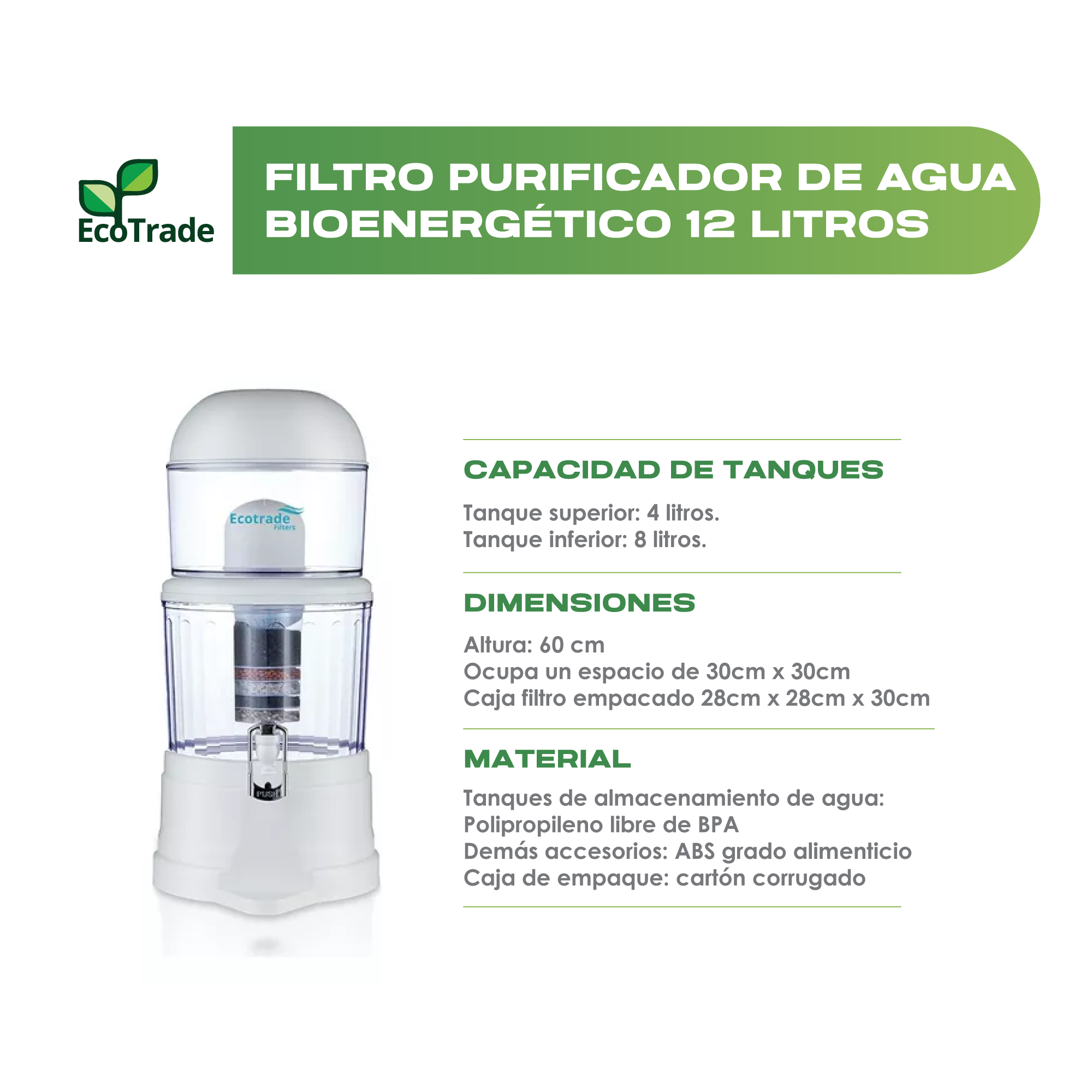 El Filtro Purificador de Agua de 12 Litros de Ecotrade Filters es ideal para hogares y oficinas que buscan agua pura, alcalina y saludable. Su avanzada tecnología elimina el 99.9% de contaminantes como cloro, flúor, metales pesados (mercurio, plomo, bromo), virus, bacterias y radicales libres, garantizando un agua cristalina, libre de olores y sabores desagradables.