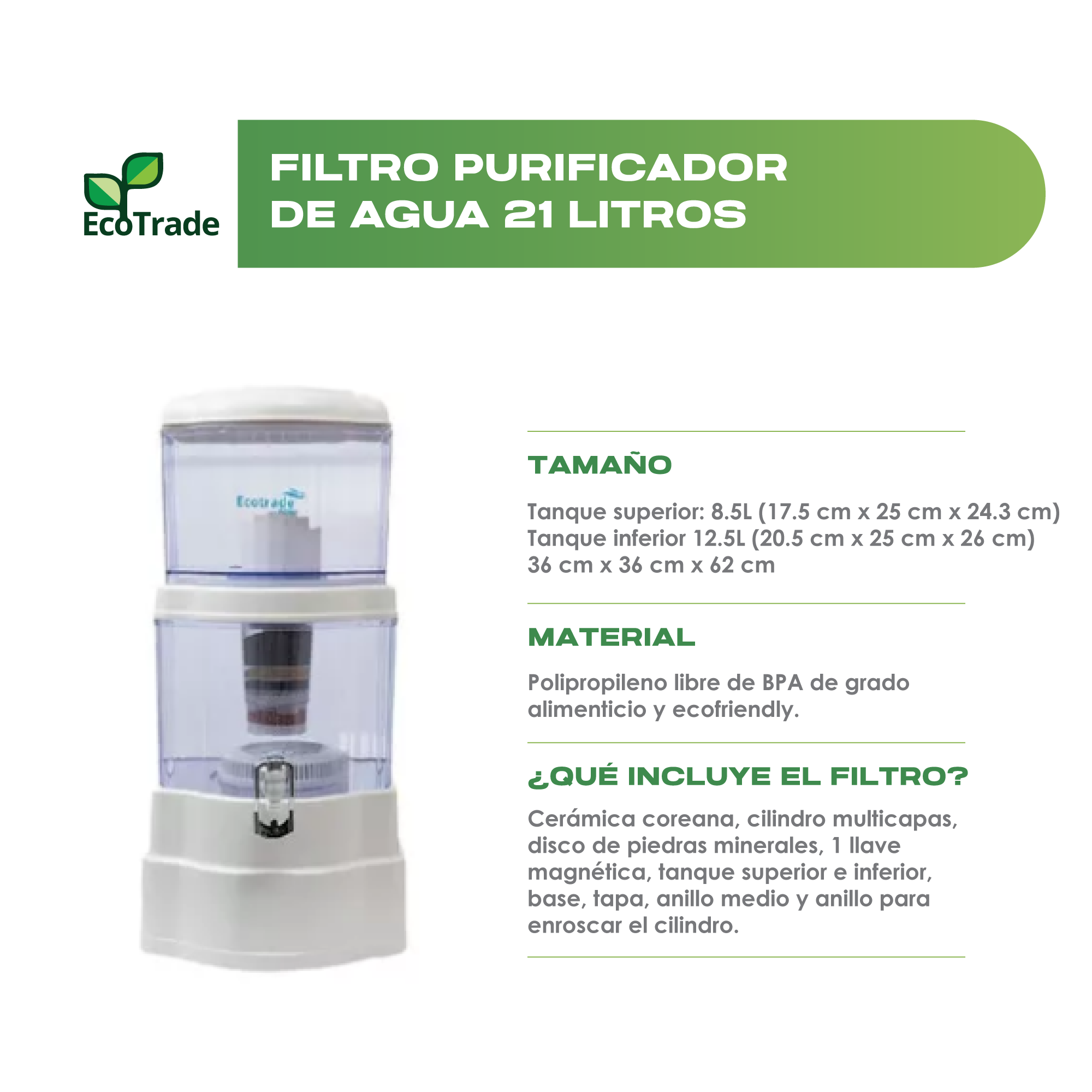 El Filtro Purificador de Agua Ecotrade Filters de 21 Litros está diseñado para proporcionar agua alcalina potable en un 99.9%, ideal para uso doméstico y de oficina. Este sistema garantiza agua natural, alcalina y enriquecida con minerales esenciales, que contribuyen a una vida más saludable.