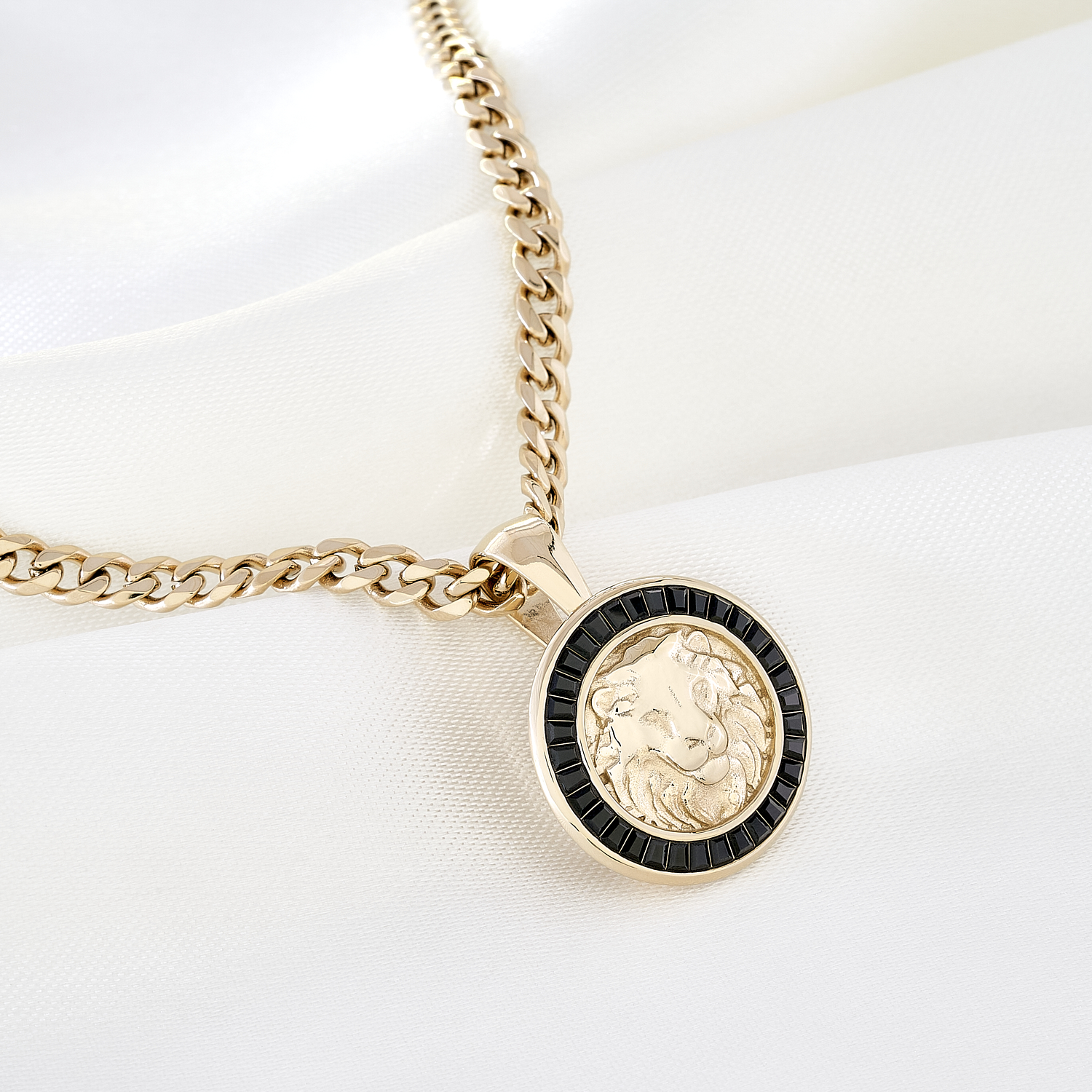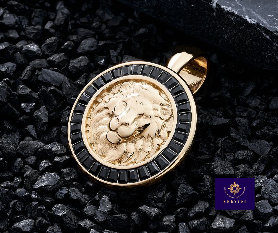 Medalla Lion en oro laminado 18K con relieve de león y gemas negras, símbolo de fuerza, liderazgo y elegancia.