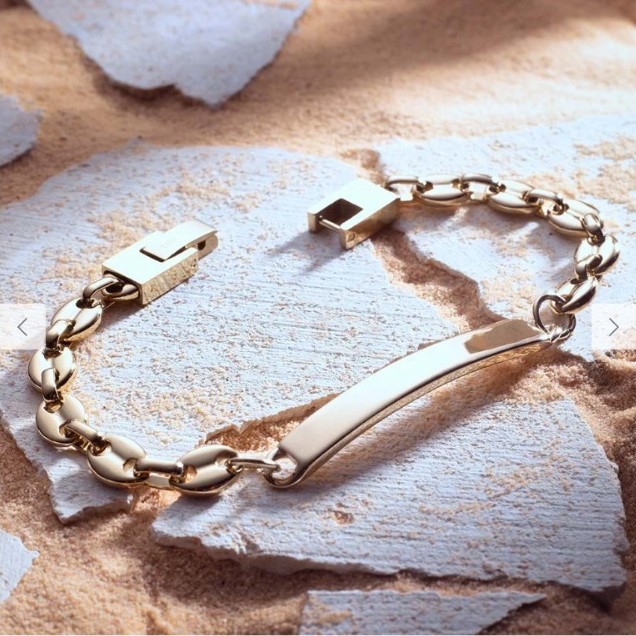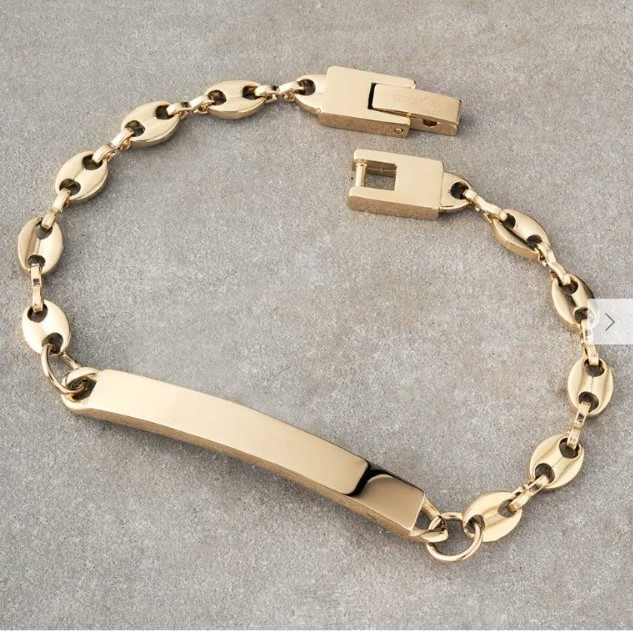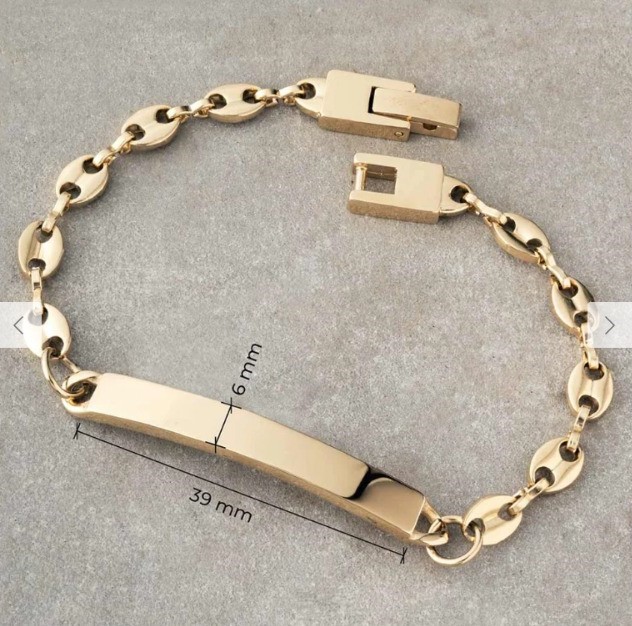 Etiquetas: brazalete con placa, joya unisex elegante, pulsera personalizada hombre, pulso grabado oro, pulso oro laminado