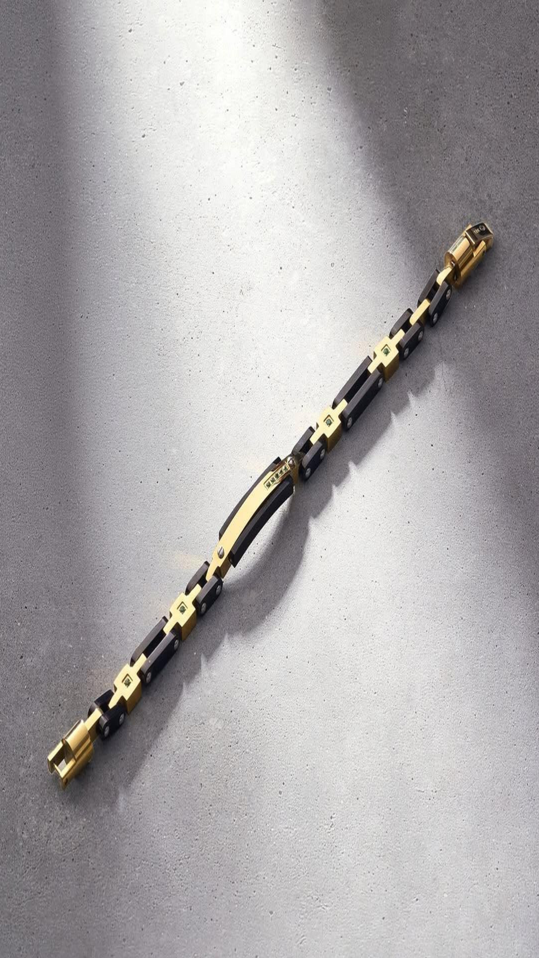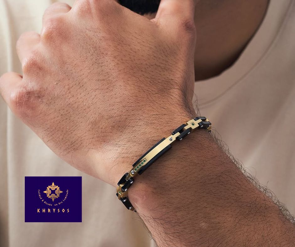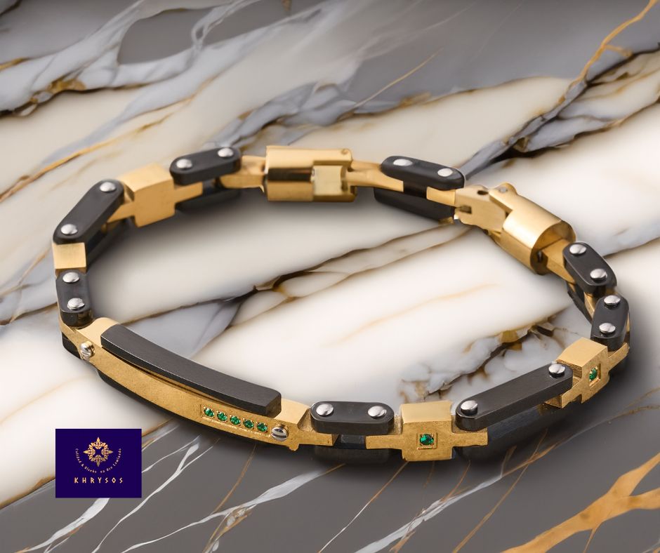 Brazalete de oro laminado 18K con gemas verdes, diseño moderno que refleja fuerza, elegancia y poder.