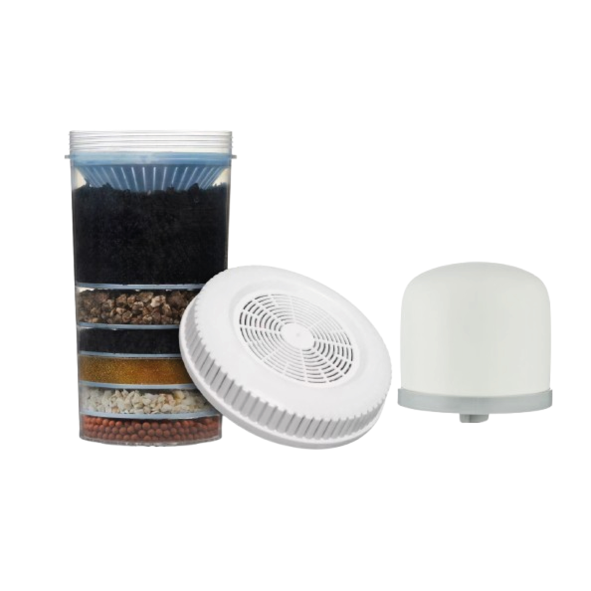 Filtro de Cerámica Coreana: Retiene sedimentos y bacterias con un filtro de poros de 0.2 micras, previniendo enfermedades como cólera, fiebre tifoidea y disentería.